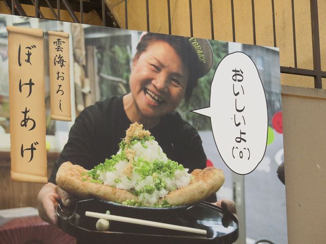 経営者夫人で自称「ぼけ取締役」のお姉さんが、自分の写真を拡大パネルにして店に貼り付けあたりを見回しています。